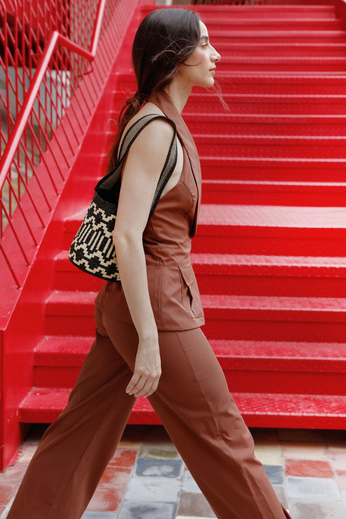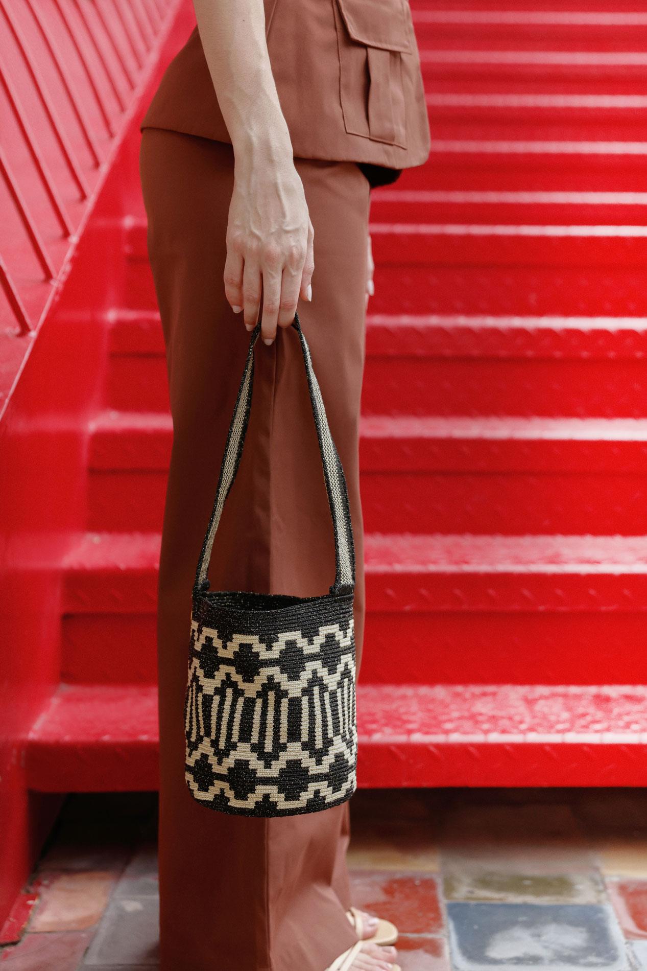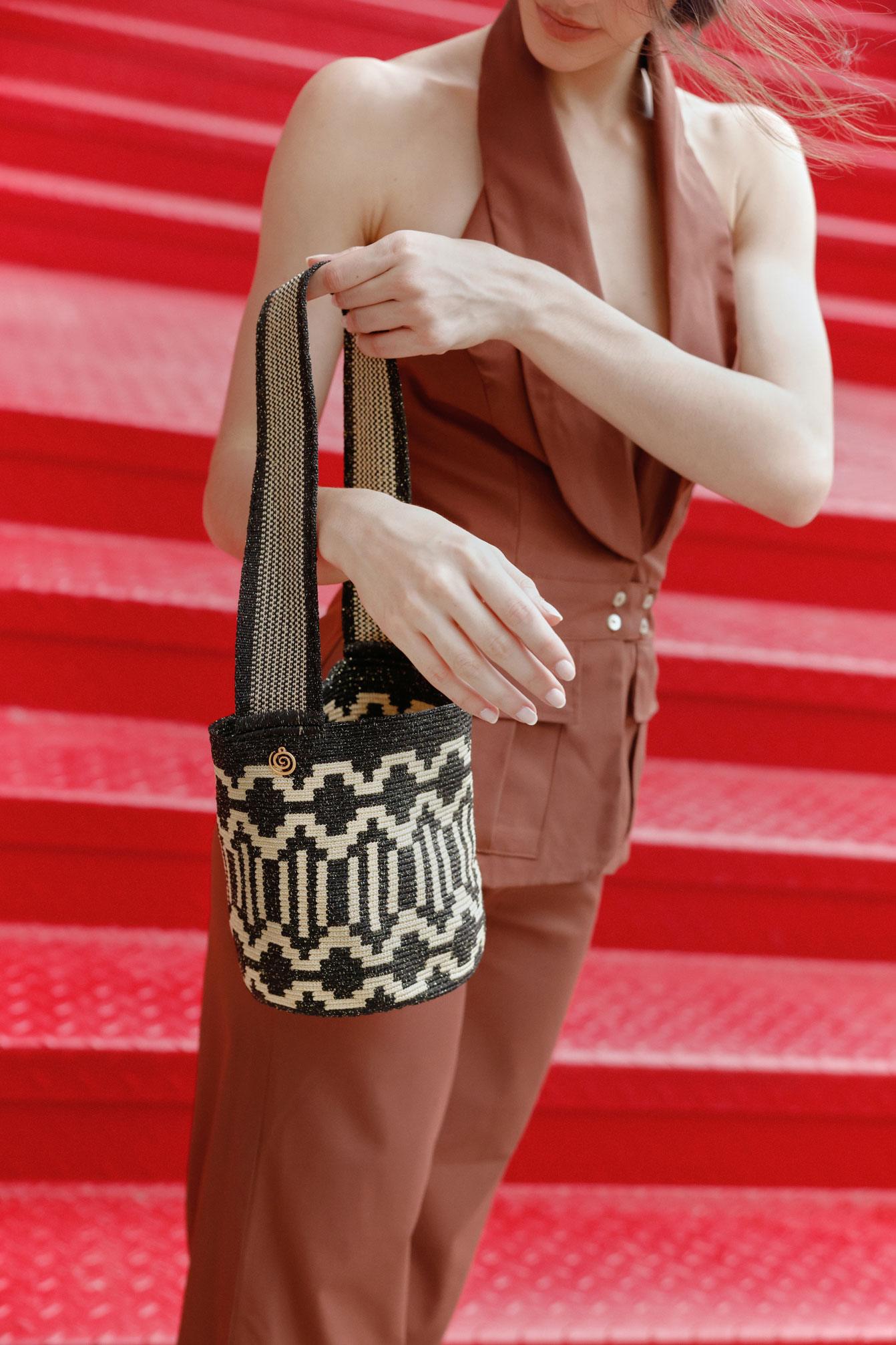 La mochila consta de cuatro partes: asa, base, cordón y borlas. Cada pieza se teje individualmente con el tejido en una hebra ancestral Wayuu, incluyendo el pegado de la asa, garantizando calidad y autenticidad.