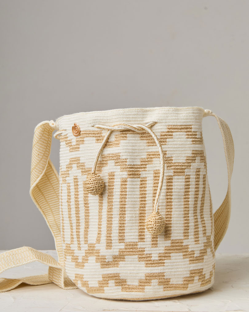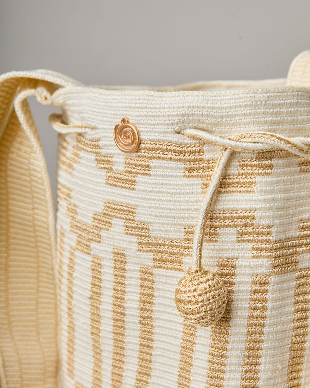 La mochila consta de cuatro partes: asa, base, cordón y borlas. Cada pieza se teje individualmente con el tejido en una hebra ancestral Wayuu, incluyendo el pegado de la asa, garantizando calidad y autenticidad.