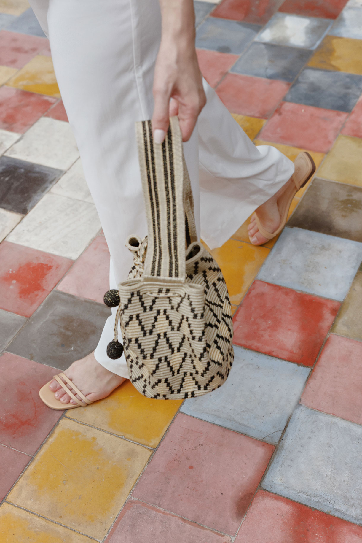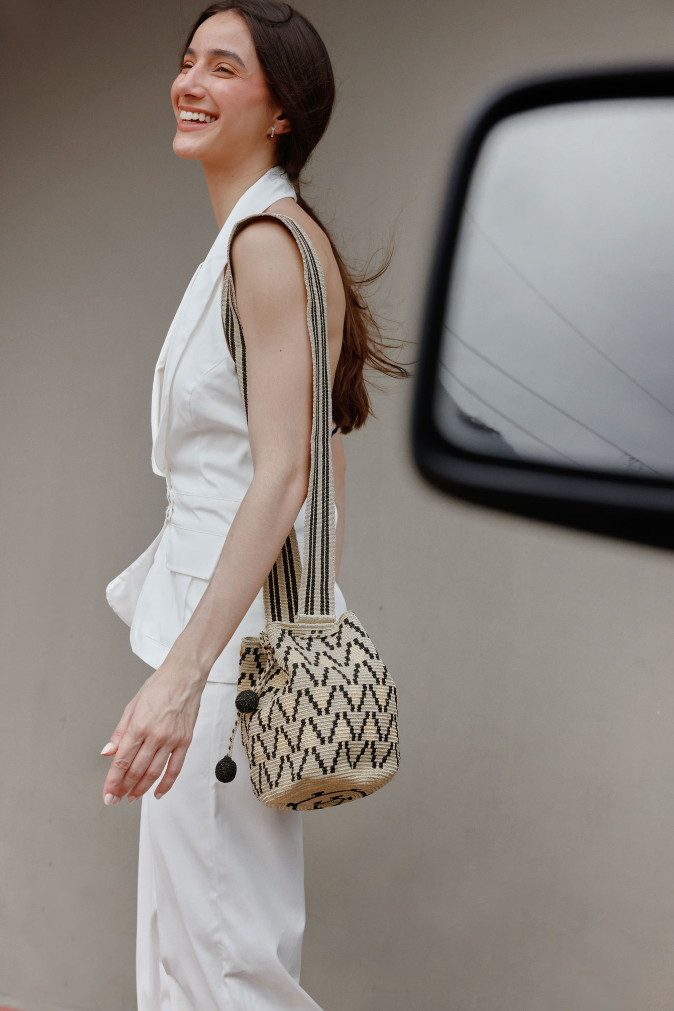 La mochila consta de cuatro partes: asa, base, cordón y borlas. Cada pieza se teje individualmente con el tejido en una hebra ancestral Wayuu, incluyendo el pegado de la asa, garantizando calidad y autenticidad.