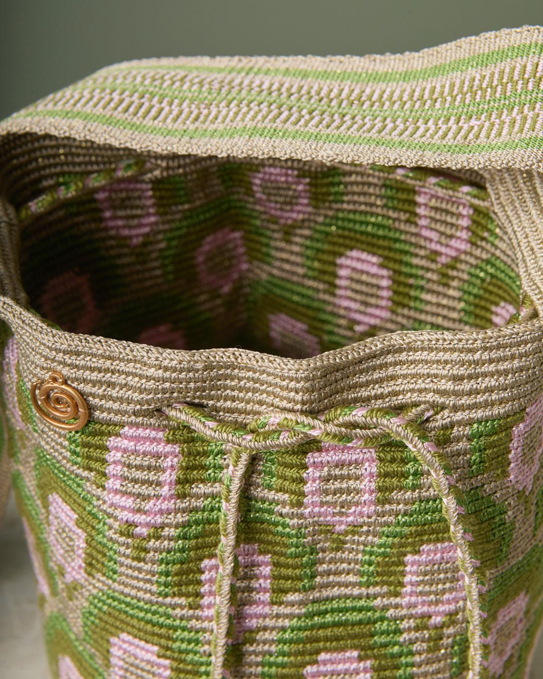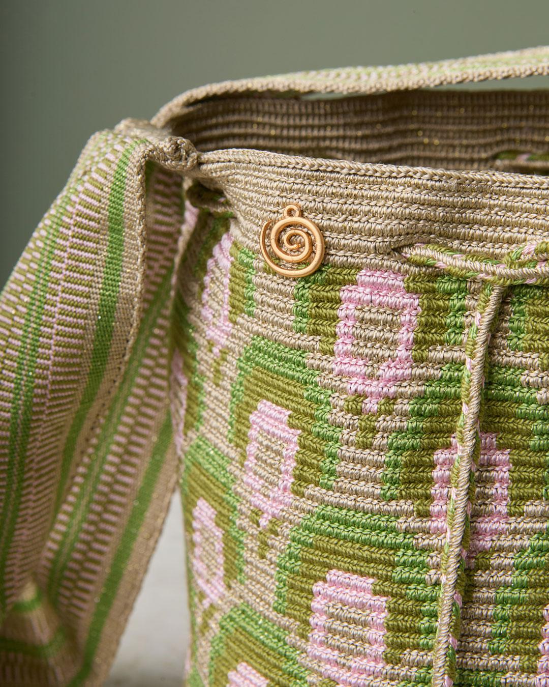 La mochila consta de cuatro partes: asa, base, cordón y borlas. Cada pieza se teje individualmente con el tejido en una hebra ancestral Wayuu, incluyendo el pegado de la asa, garantizando calidad y autenticidad.