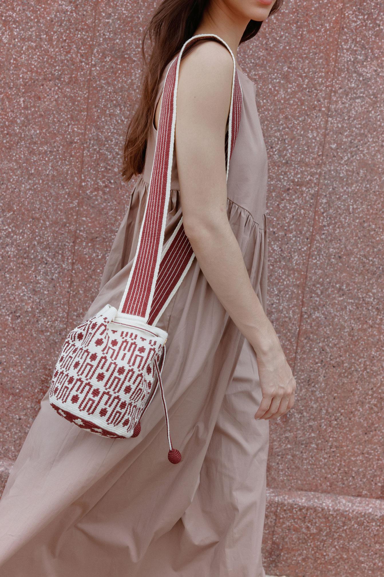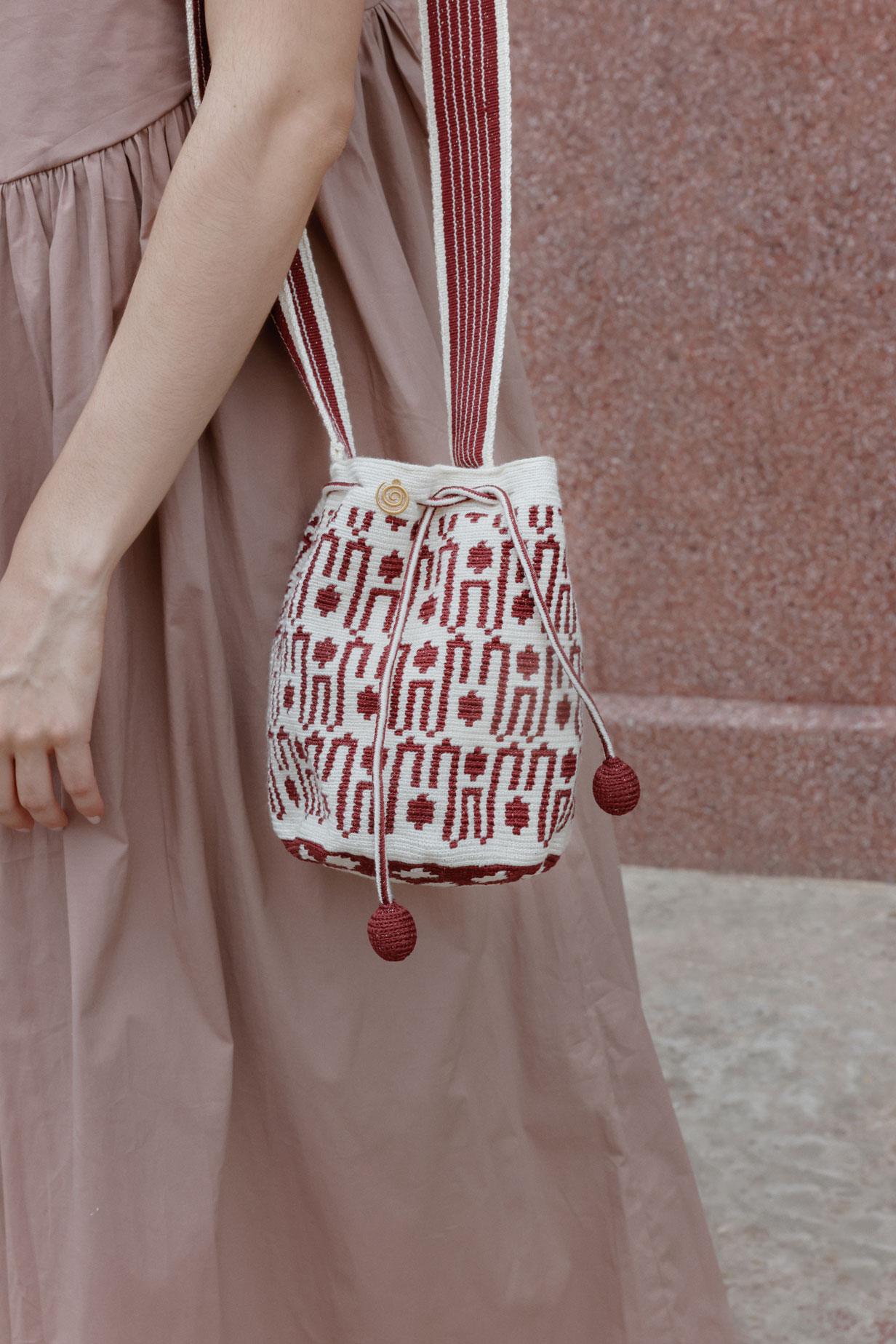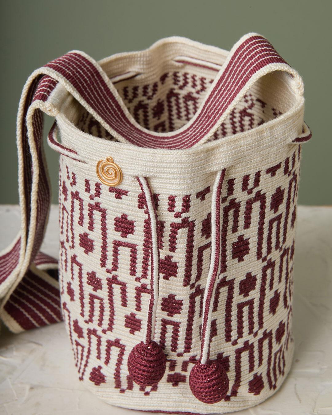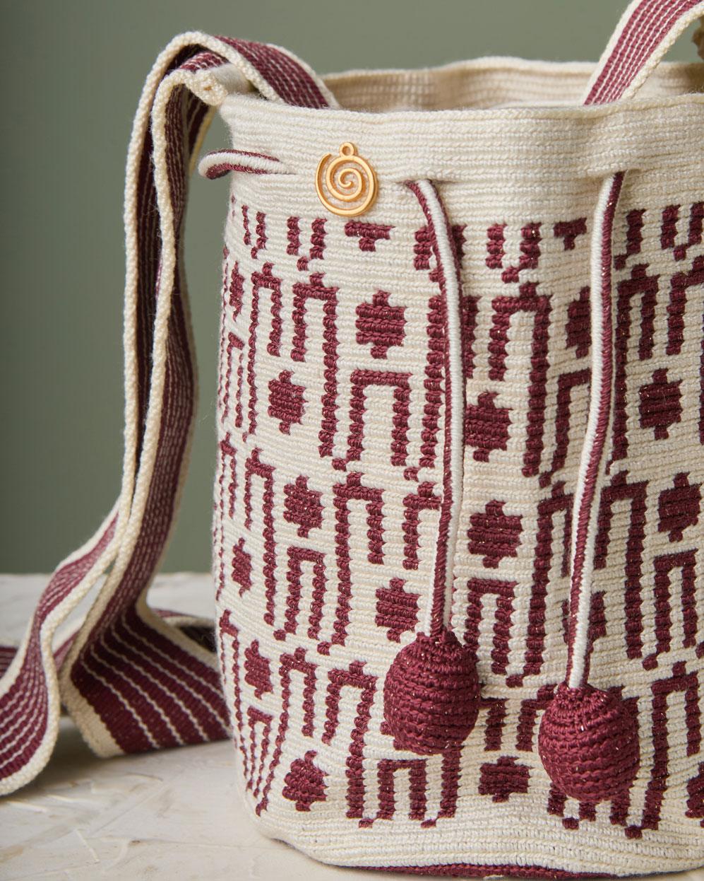 La mochila consta de cuatro partes: asa, base, cordón y borlas. Cada pieza se teje individualmente con el tejido en una hebra ancestral Wayuu, incluyendo el pegado de la asa, garantizando calidad y autenticidad.